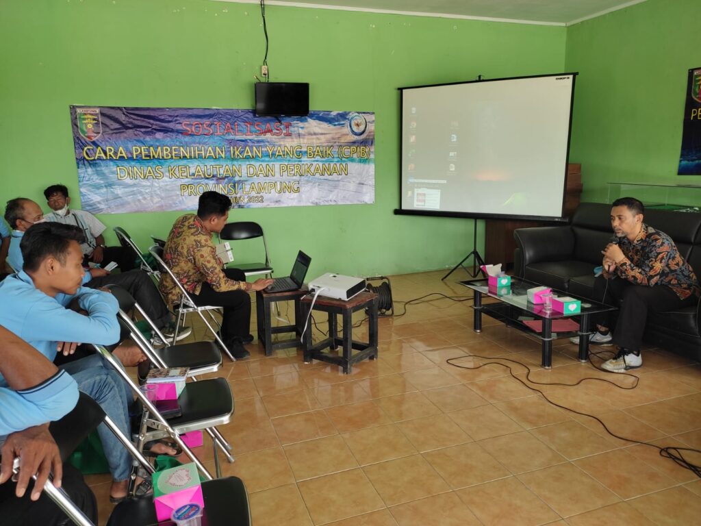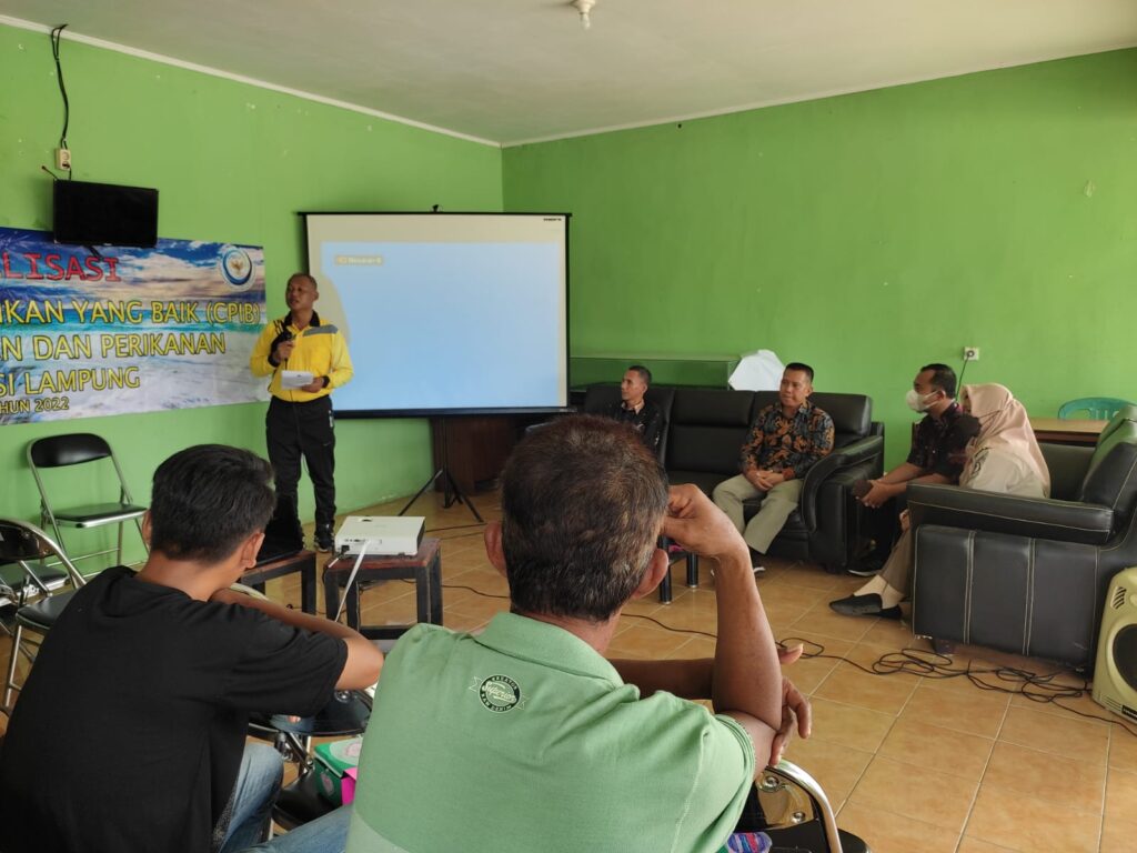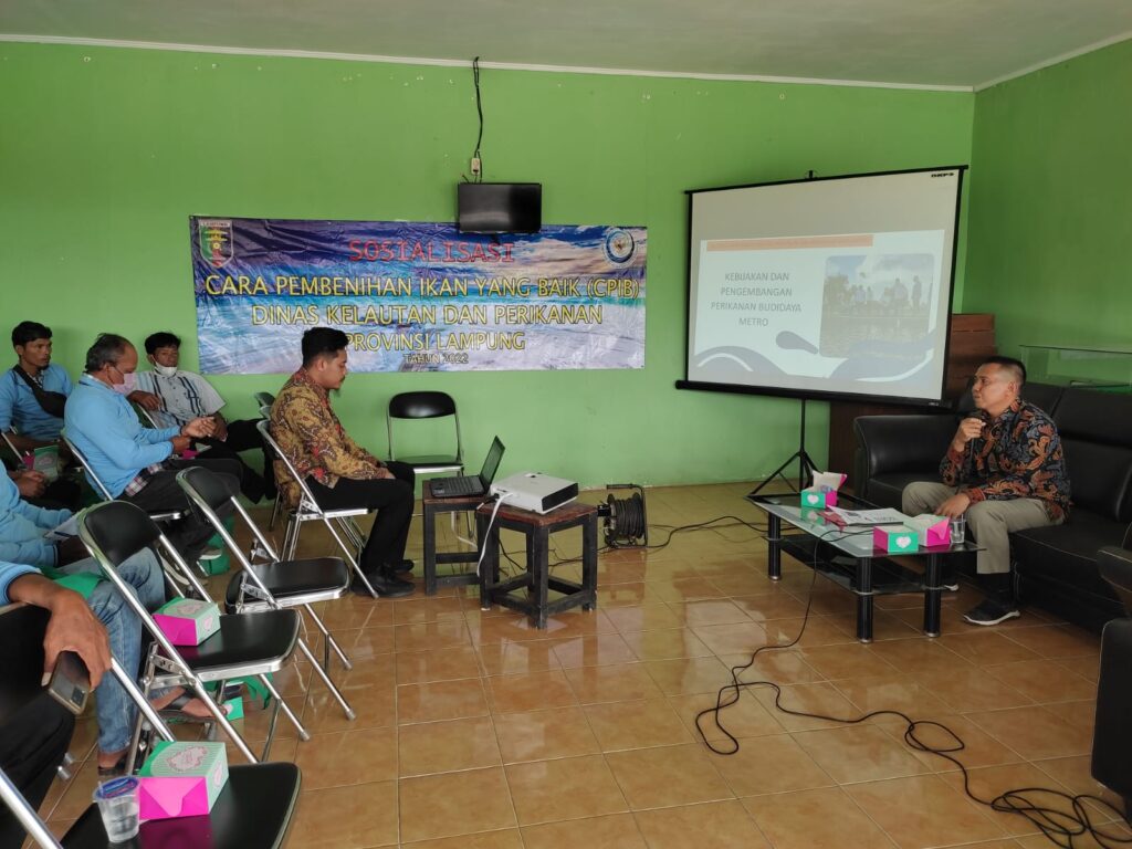 Jumat, 25 November 2022, Dinas Kelautan dan Perikanan Provinsi Lampung beserta perwakilan dari Balai Karantina Ikan, Pengendalian Mutu, dan Keamanan Hasil Perikanan Lampung menyelenggarakan sosialisasi CPIB (Cara Pembenihan Ikan yang Baik), serta Pengelolaan Kesehatan Ikan dan Lingkungan. Kegiatan sosialisasi ini menyasar para pembenih lokal Kota Metro, yang tergabung dalam beberapa Pokdakan. Hadir dalam kesempatan itu, Pak Didu selaku Sub-Koordinator Produksi & Pengembangan Perikanan Budidaya, Pak Edysson, selaku Sub-Koordinator Pengendalian Kesehatan, Pakan, dan Obat Ikan, Dinas Kelautan dan Perikanan Provinsi Lampung, dan sebagai pemateri, Ibu Endah Wahyuni, S.Pi., M.Pi. dari Badan Karantina Ikan, Pengendalian Mutu, dan Keamanan Hasil Perikanan.